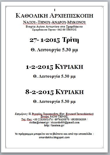 Ενοριακό Πρόγραμμα από 27 Ιανουαρίου 2έως 8 Φεβρουαρίου 2015 Το πρόγραμμα πλέον θα το βλέπετε από την σελίδα : agiosantoniossmardakito.blogspot.gr